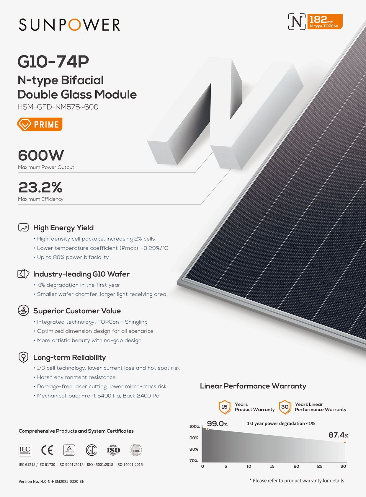 • Low Degradation Rate: In the first year, the Sunpower 590Wp TOPCon & Shingling Panel experiences only 1% efficiency degradation, with subsequent years maintaining an incredibly low rate of 0.4% per year.