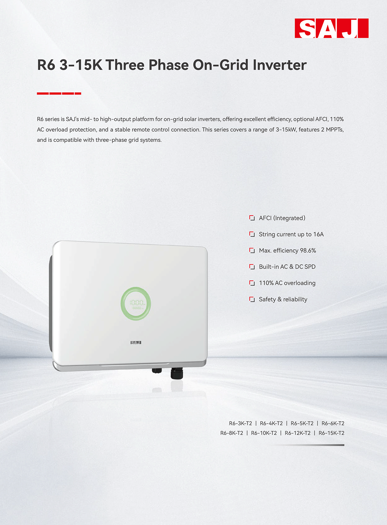 Kết luận: Với sự kết hợp hoàn hảo giữa hiệu suất 98.6% và công nghệ an toàn AFCI, biến tần hòa lưới SAJ R6 3-15kW là lựa chọn thông minh để bảo vệ và tối ưu hóa hệ thống điện mặt trời 3 pha cho công trình của bạn.