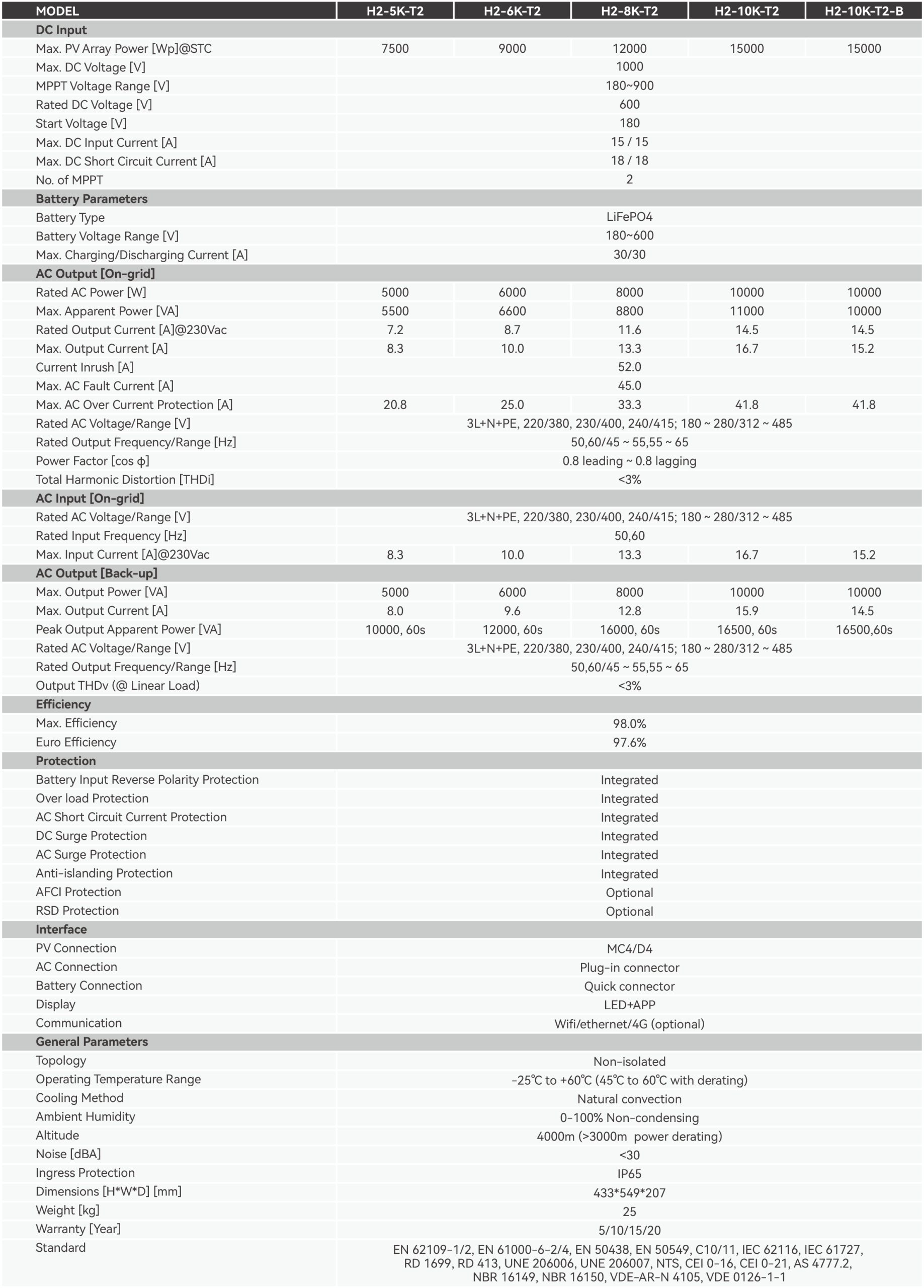 4. Thông số kỹ thuật chi tiết Biến tần Hybrid SAJ H2 5-10kW T2