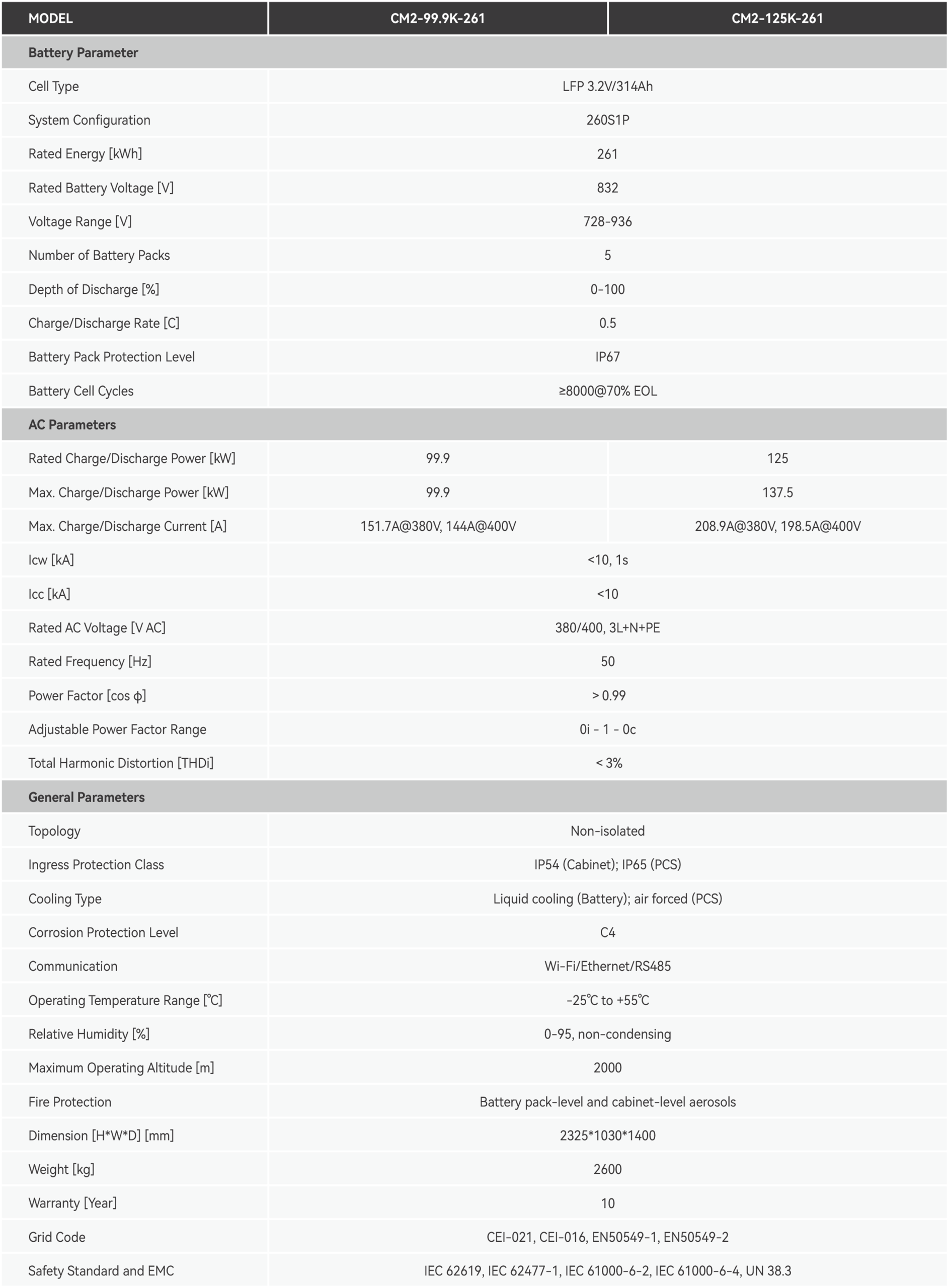 3. Thông số kỹ thuật chi tiết Hệ thống lưu trữ năng lượng SAJ CM2 261kWh