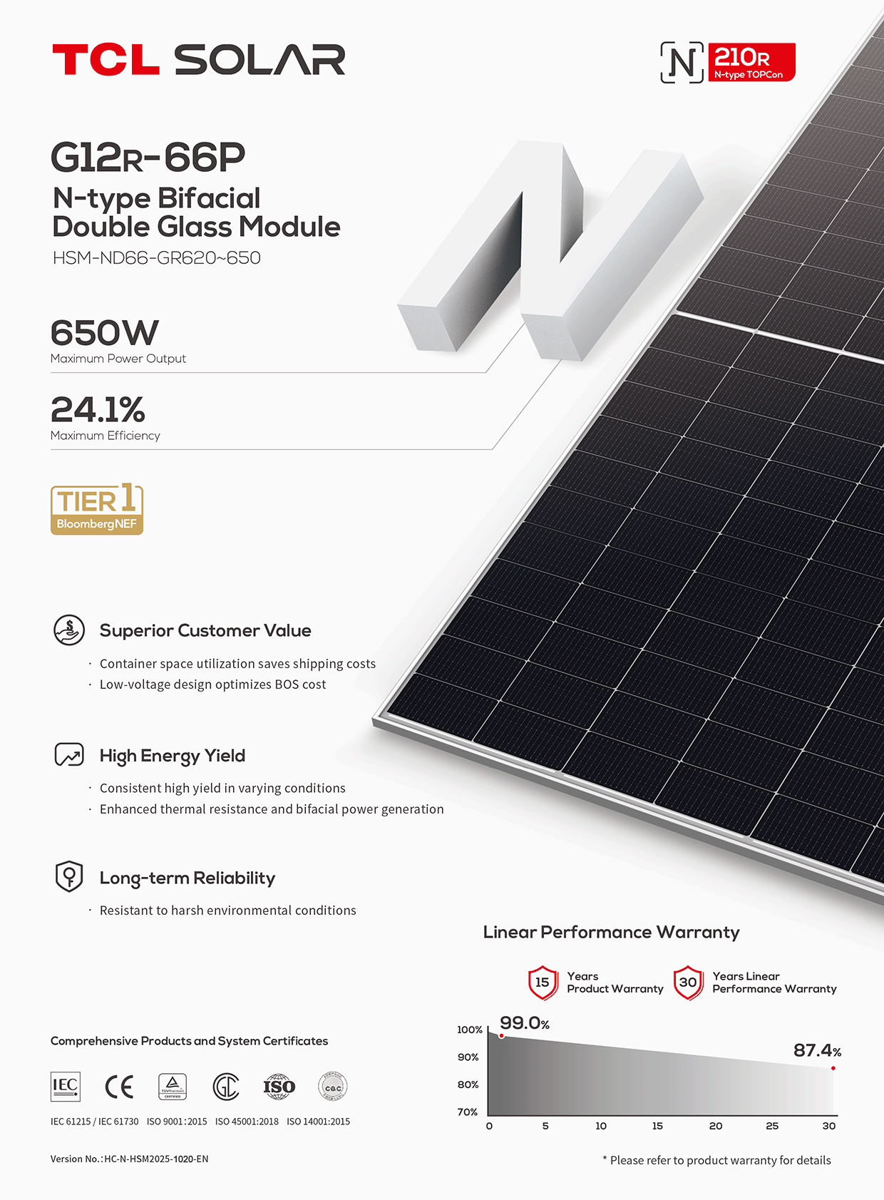 Đầu tư vào Tấm Pin Năng Lượng Mặt Trời TCL Solar 650W là sự lựa chọn thông minh nhờ cam kết bảo hành từ thương hiệu thuộc danh sách Tier 1 BloombergNEF. TCL Solar cung cấp gói bảo hành sản phẩm 15 năm và bảo hành hiệu suất tuyến tính lên đến 30 năm.