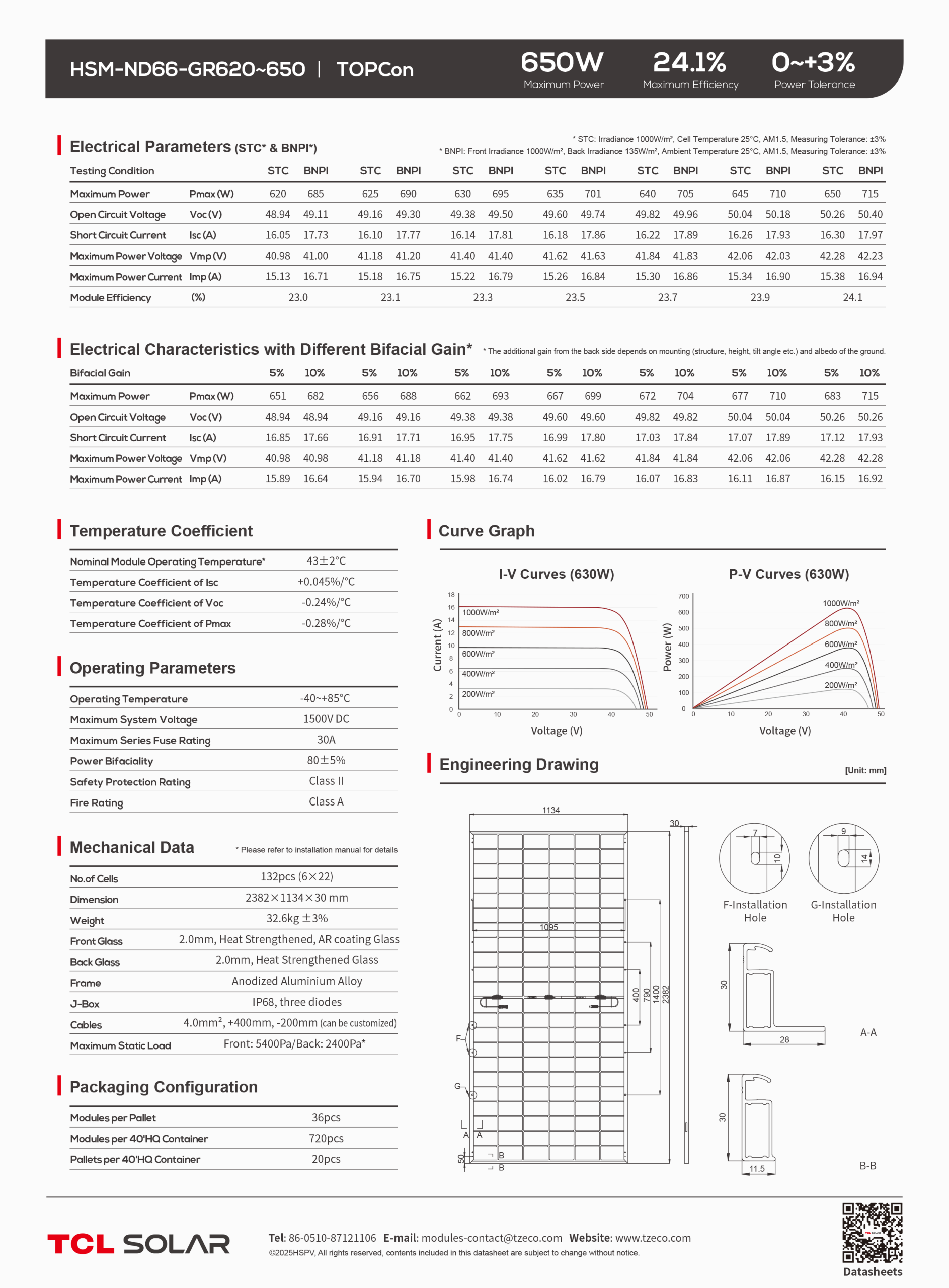Việc lựa chọn Tấm Pin Năng Lượng Mặt Trời TCL Solar 650W giúp các dự án tối ưu hóa diện tích lắp đặt nhờ công suất cực đại mạnh mẽ. Dưới đây là những thông số kỹ thuật tạo nên uy tín cho sản phẩm: