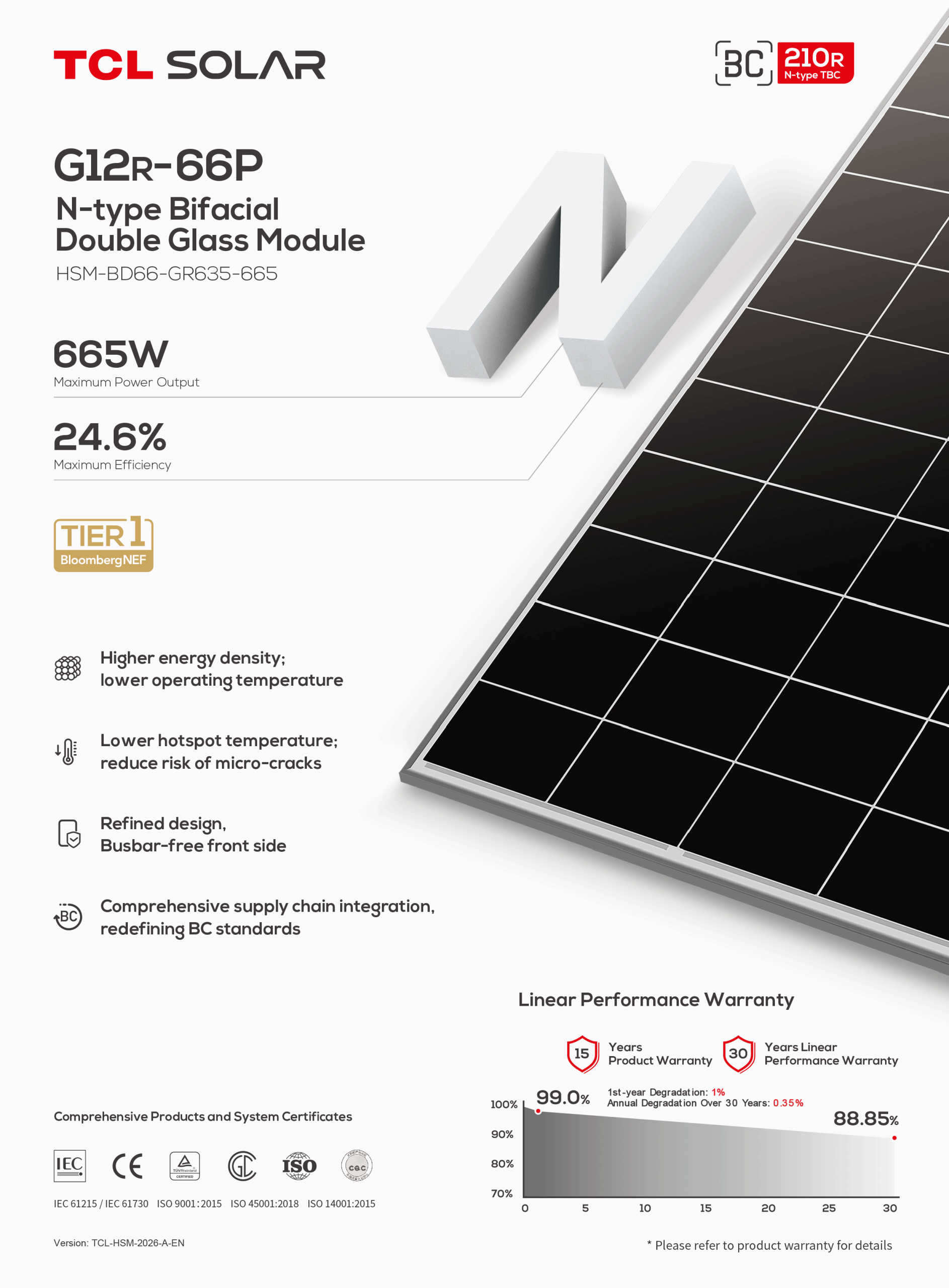 Hệ số nhiệt độ: Chỉ -0.26%/ độ C, giúp Tấm Pin Năng Lượng Mặt Trời TCL Solar 665W phát điện ổn định dưới trời nắng gắt.