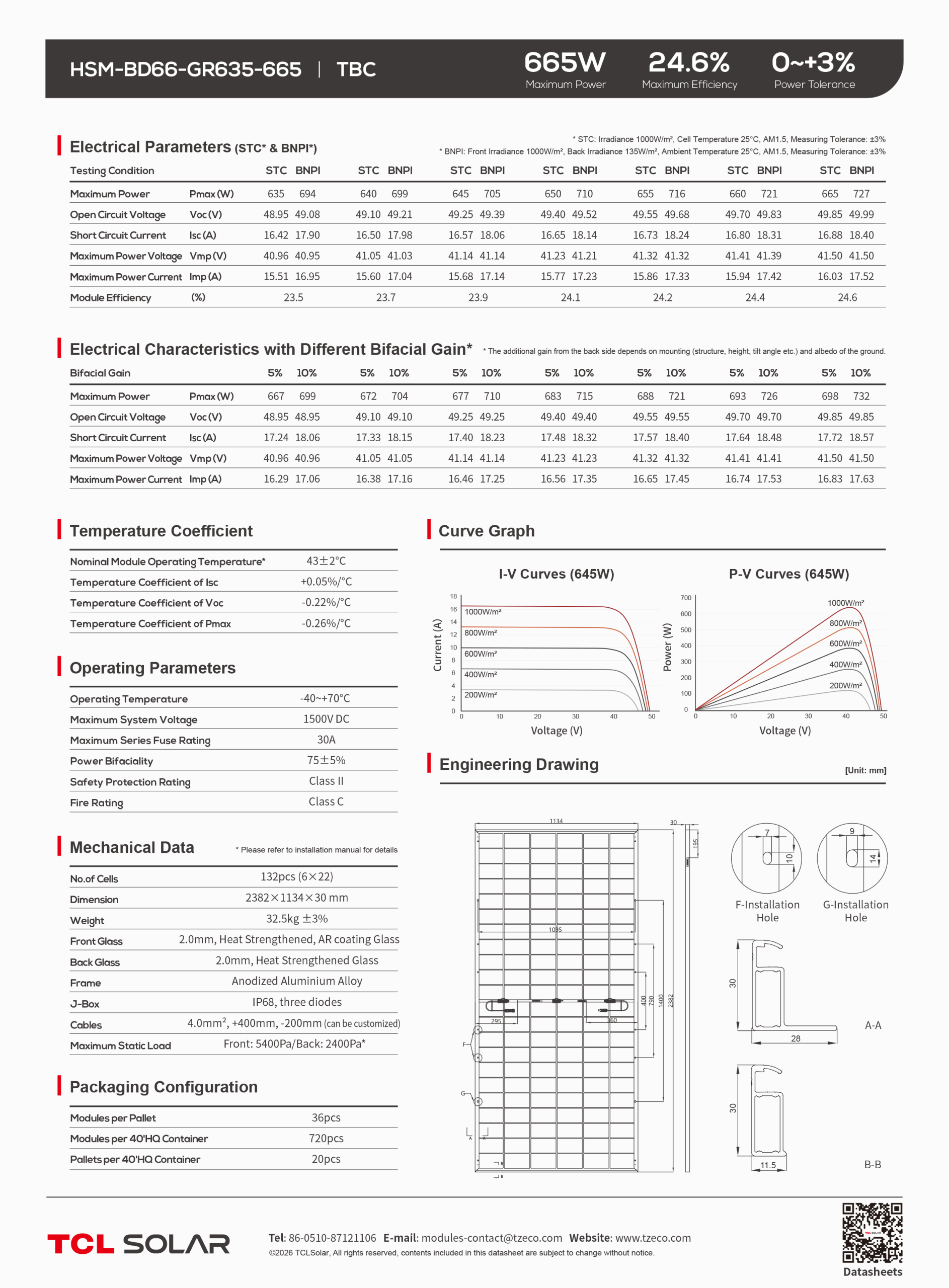 Sự mạnh mẽ của Tấm Pin Năng Lượng Mặt Trời TCL Solar 665W được thể hiện qua bảng thông số kỹ thuật ấn tượng từ nhà sản xuất: